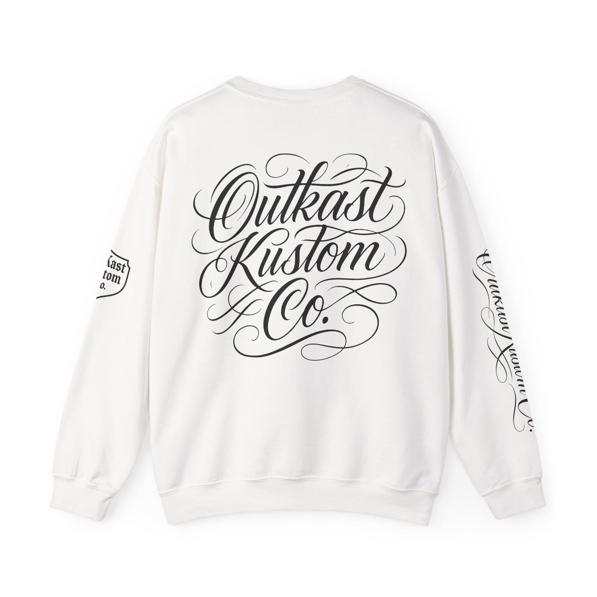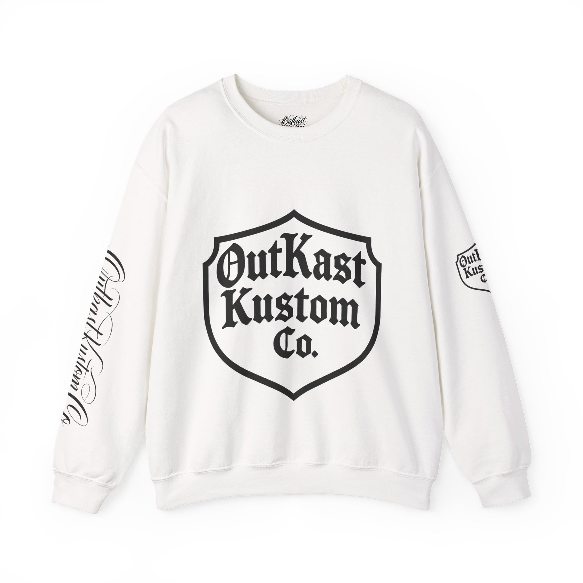 This cozy crewneck brings together streetwise lettering and wearable comfort. The clean white sweatshirt features bold, shield-style logo on the front, a flowing script logo across the back, and matching sleeve details for a cohesive, handcrafted look. It wears like a favorite — soft, substantial, and built to last — so it becomes part of your regular rotation for cool mornings, late-night drives, and laid-back meetups. The embroidered/printed accents give it an artisanal edge that reads handcrafted rather than mass-produced, pairing effortlessly with jeans, layered outerwear, or a beanie when the temperature dips.